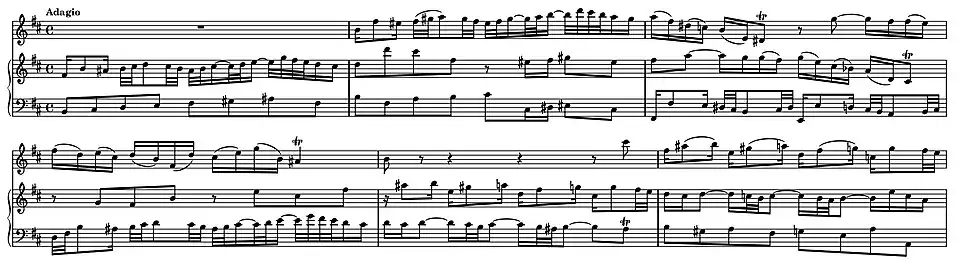 The fourth movement is an Adagio in B minor in common time. Of 21 bars in length, its tonal function is to mediate between the keys of the central and final movements (E minor and G major). The contrapuntal material of themes and counter-themes is shared and exchanged between all three parts; the long phrases in the main theme provide a soaring melody for the violin. The first version of the sonata also had an Adagio in B minor with a similar function but, as Richard Jones comments, the later replacement is "more elaborate and of greater expressive weight and substance." Asmus (1982) gives a detailed analysis of the musical structure of the Adagio, which alternates between two contrasting elements, the interplay between the two underlying the architecture of the movement. The first "arc-shaped" element is the fugue theme—florid, melodic, rhythmically complex and based around the tonic key. It is heard in the first bar in the harpsichord over a rising scale of quavers in the bass. An inverted version of the opening motif appears in the bass line in the third bar as the two upper voices play descending figures semiquaver couplets, which not only complete the melodic line of the fugue theme in the violin part but also provide a counter-theme. The second "rectilinear" element—more severe, chromatic and modulating—is first heard with its own counter-theme in the fifth bar. It is formed of a chain of motifs descending in crotchets, with syncopated rhythms related to those of the fugue theme. Time-wise the first element accounts for the majority of the movement, but the second element governs its tonal structure. Halfway through the movement in bar 11 the tonality reaches the relative major key of D major, but only fleetingly. The melody of the fugue subject and a variant of its completion return in the violin. After two bars of the chromatic syncopated material, the motifs of the fugue subject, broken up between all three voices, lead up to two cadences in F minor. The second element returns in the final two bar coda as the music modulates to the closing cadence in D major, in anticipation of the fifth movement in G major. [18]