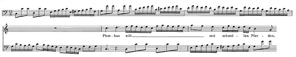 time. Written for three voices in ABA da capo form, it is a hybrid movement, combining features from the tutti fugue and the concerto allegro. The energetic quaver theme in the fugal ritornello section is made up of repeated notes; the semiquaver counter-theme is also made up of repeated notes. Schweitzer and subsequent commentators have pointed out—without drawing any definite conclusions beyond the practise of self-borrowing—that the subject, countersubject and other motifs in the ritornello have strong affinities with the aria for soprano and continuo Phoebus eilt mit schnellen Pferden ("Phoebus speeds with swifty steeds") from the secular Wedding Cantata Weichet nur, betrübte Schatten, BWV 202 dating from Bach's period in Weimar. Jones (2007) notes that probably in the original aria the quaver figures musically represented the trotting of horses and the semiquavers their swiftness.