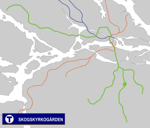 Skogskyrkogården metro station is on the green line of the Stockholm metro, located in Gamla Enskede, Söderort, very close to the cemetery Skogskyrkogården (the Woodland Cemetery). The station was opened on 1 October 1950 as part of the inaugural stretch of Stockholm metro between Slussen and Hökarängen.[2] The distance to Slussen is 5 km (3.1 mi).