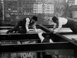 Charles Musser remarks that both Skyscrapers and another film produced by Biograph in 1906, The Tunnel Workers, "involve melodramatic confrontations between men from different levels of management, and both were shot on locations that received significant news coverage." He notes the contrast between the actuality material included at the beginning of the film (five first shots) and the scenes shot on location with professional actors which display "a wide range of presentational elements (conventionalized acting gestures, melodramatically contrived plots) with the result that an informal, spontaneous, catch-as-catch-can style of filming suddenly shifts to old-style theatrical conventions as quotidian space is turned into a stage."[2] Ilaria Serra stresses the interest of the first five shots: the introductory panoramic from a camera placed on a skyscraper "gives a unique view of an infant New York, its rooftops, a cupola, buildings, and some surviving trees. The camera then turns toward the groups of workers (...) There is always someone who stares at the camera and gives spontaneity to the scene, reminding us that these are not actors. The camera moves on to two breathtaking subjects: a group of workers climbing on big iron bars—the bone structure of the skyscraper and remaining suspended there and four other workers in groups of two hanging from the iron rope of a huge crane and moving through the emptiness [followed by] a camera movement that shows buildings and factories."[6]
