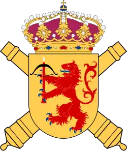 The coat of arms of Småland Artillery Regiment (A 6) from 1977 to 1985. Blazon: "Or, the provincial badge of Småland, a double-tailed lion rampant gules, armed and langued azure, in the forepaws a crossbow gules, arrowhead argent, bow and string sable. The shield surmounted two gunbarrels of older pattern in saltire or. The gunbarrels may be sable."[3]