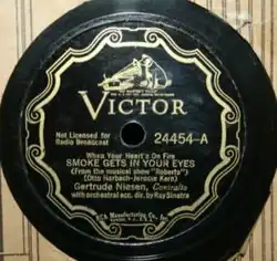 "Smoke Gets in Your Eyes" is a show tune written by American composer Jerome Kern and lyricist Otto Harbach for the 1933 musical comedy Roberta. The song was sung in the Broadway show by Tamara Drasin. It was first recorded by Gertrude Niesen, with orchestral direction from Ray Sinatra, Frank Sinatra's second cousin,[1] on October 13, 1933. Niesen's recording of the song was released by RCA Victor, with in the B-side "Jealousy", a song featuring Isham Jones and his Orchestra.[2] The line "When your heart's on fire, smoke gets in your eyes" apparently comes from a Russian proverb.[3]