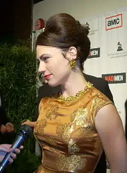 Producers of Mad Men approached January Jones to portray Betty Draper, Don's wife and the mother of their two children. Jones avouched that portraying the character would give the audience an opportunity to see a dark side of her nature.[11] She initially auditioned for the role of Peggy Olson, which was later given to fellow cast member Elisabeth Moss. "It got down between Elisabeth Moss and myself, and it was obviously more suited to her, but Matthew had said, you know, there's this other role, of the wife."[12] Jones signed a seven-year contract with the show, although her character originally had two lines in "Smoke Gets in Your Eyes." Weiner eventually edited the script to accommodate her desires.[12] "It's such a testament to his ability," Jones stated. "He just took something out of thin air, which makes me think now that he had to have had an idea that the wife was going to be part of the show, because I kind of took the job with the promise that Betty would be a part of the show. When you sign a seven-year contract, you want to make sure you're in the show."[12] Christina Hendricks was brought in to play Joan Holloway, the office manager and head of Sterling Cooper's secretarial pool. While Hendricks had previously made recurring appearances on ER before being on Mad Men, her acting career had been largely inactive, and Hendricks' agent urged her not to participate in the project.[13] "They said to me, 'AMC [...] doesn't have any other big shows—why would you do this instead of taking something that's a better bet?' I said, 'Look, I've gone with the one that's the better bet in the past—let's go with the really good script this time.'"[13]