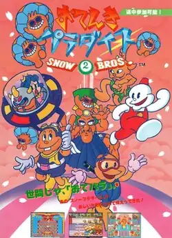 Snow Bros. 2: With New Elves[a] is a 1994 platform arcade video game developed and published by Toaplan under their Hanafram label.[2][3][4] One of the last games to be created by Toaplan, it is the sequel to Snow Bros., which was released earlier in 1990 on multiple platforms. In the game, players assume the role of one of the playable characters to rescue a kidnapped princess from captivity.