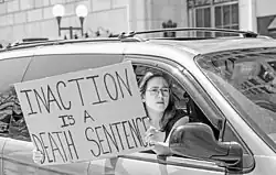 More than 38,000 people were detained by U.S. Immigration and Customs Enforcement (ICE) at the time of the outbreak of COVID-19 in the United States.[82] ICE's response to the outbreak in detention facilities was widely characterized as substandard and dangerous.[83] Detained people reported that they were being forced into unsafe, unsanitary, and harmful conditions.[84] Serious irregularities in ICE's testing data were reported[85] while ICE blocked coronavirus testing information at its facilities from being released to the public.[86] The American Civil Liberties Union referred to the COVID-19 pandemic in U.S. immigration detention as "an unquestionable public health disaster".[85]