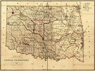 The "Oklahoma lands" — the entire future state of Oklahoma with the exception of the narrow western panhandle — were first set aside as a site to which Native American populations were to be deported from their ancestral homelands in the 1830s.[2] It was there that the so-called "Five Civilized Tribes" — the Cherokee, Seminole, Choctaw, Chickasaw, and Muscogee (Creek) peoples — were relocated at that time, clearing the way for European-American colonization of their previous lands.[2] Following the conclusion of the American Civil War the Federal government used the fact of these five Native American peoples' support of the Confederate States of America as a pretext for retaking approximately half of these "Oklahoma lands."[2] This freed new area for additional forced relocations of other Native American peoples.[2]