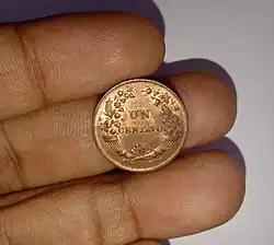 1 Centavo (UN CENTAVO) coin of Republic of Peru (REPUBLICA PERUANA) reverse side. The coin is made of bronze, minted in 1944.