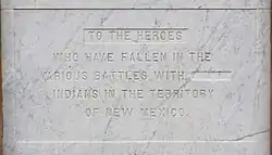 The monument consists of a stone obelisk with four engraved marble panels on the stone base commemorating U.S. soldiers who died in battles in New Mexico. It is located in the central area of the Santa Fe Plaza in downtown Santa Fe.[11] The monument has a stone foundation; a locally produced brick and lime core plinth; local stone inscribed panels; imported Italian marble trim with marble columns and marble wreathes (Victorian funerary motifs), and marble obelisk. The cenotaph, with its Egyptian architectural associations, is 33-feet tall.[9][12] Builders were McGee & Brother (John and Michael McGee), architects, master stone cutter Tomas Baca, and local craftsmen.[13] The stone panels were inscribed by local craftsmen.[14]