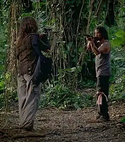 Sayid and Danielle Rousseau have a stand-off in the jungle after Sayid leaves Rousseau’s confinement