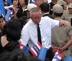 Citing the claimed failure of popular democracy in Thailand, Sondhi has suggested constitutional amendments that some members of parliament should be chosen by profession, a proposal that was seen as 'undemocratic' by his opponents.[10][11] Closely affiliated with Queen Sirikit and prominent royalists, Sondhi regularly invoked king Bhumibol Adulyadej in his protests, and has claimed that his enemies are disloyal to the monarchy, aiming at destroying the country's political form.[12][13][14] Sondhi has openly called for the military and Thailand's traditional elite to take a greater role in politics.[15]