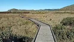 Although some parts of the park are too steep for easy access between Route 1 and the ocean, Kortum Trail is convenient for hiking between highway access points at Goat Rock, Shell Beach, and Wright's Beach.[6] Total trail length is approximately 3.8 mi (6.1 km).[7] The well-maintained trail includes wooden walkways across wetlands and bridges over streams.[8] Side trails offer access to the beach and to bouldering opportunities at Sunset Boulders. Whales may be seen offshore and wildflowers, birds, and deer can be observed within the coastal park.[9]