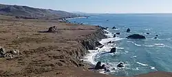The active San Andreas Fault runs roughly parallel and near to the coastline of Sonoma Coast State Park. Soils within the site are classified as coastal beach sands (where rocky shoreline is not evident) and marine escarpment group soils on the marine terrace; typically soils above the marine terrace are in the Rohnerville loam group.[1] Most of the beach sands consist of a medium coarse brown to gray sandy materials, reflecting the high rate of erosion of escarpment soils into the ocean. There are patches of smooth pebble beach such as the approximately one hundred meter stretch lying immediately north of Goat Rock.