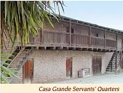La Casa Grande was the Vallejo family's first home. At the time one of the most imposing and well-furnished private residences in California. It stood with its wide second-story balcony overlooking the town's plaza. Although the house was not finished until 1840, there is reason to believe that a portion of it was completed in time for Vallejo's second daughter to be born there on January 3, 1837. In all, eleven Vallejo children were born in the house. Over the years La Casa Grande became the center of social and diplomatic life north of San Francisco Bay. About 1843, Mariano Vallejo added a three-story adobe tower to the southwestern corner of the house. From this vantage point it was possible to look out over several miles of the Sonoma Valley. An adobe wall connected the tower and Salvadore Vallejo's house to the west.[11] Built in an L-shape, the rear section contained a kitchen and sleeping quarters for Vallejo's staff of Native Indian servants.[12]