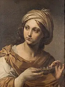 There are a number of paintings of Sophonisba drinking her poison, but the subject is often very similar to that of Artemisia II of Caria drinking her husband's ashes, and the Rembrandt in the Prado (now known as Judith at the Banquet of Holofernes) and a Donato Creti in the National Gallery are examples of works where the intended subject remains uncertain between the two.[14] A 17th century tapestry, showing the meeting of Sophonisba and Masinissa, is preserved from Brussels, following a painting by Rubens.[15]
