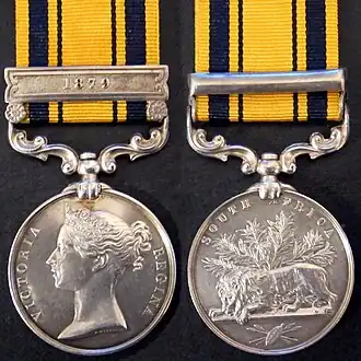 The South Africa Medal (1880), often referred to as the Zulu War Medal, is a campaign medal instituted in 1880 and awarded by the British Government to members of the British Army, Royal Naval Brigade and Colonial Volunteers who were involved in a series of South African tribal wars in the Cape of Good Hope, Colony of Natal and Transvaal between 1877 and 1879, most notably for the Anglo-Zulu War of 1879.[2]
