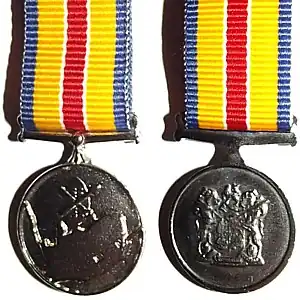 The South Africa Service Medal is a medallion struck in nickel-silver, 38 millimetres in diameter with a raised rim, and depicts a crossed knobkierie and spear on an African shield above a map of South Africa.[1][8][9][10]