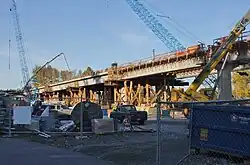 On-site construction began in June 2017 with the preparation of work areas and installation of fencing.[79][80] The historic Frederick W. Winters House and blueberry farms in Mercer Slough Nature Park closed to visitors in October to prepare for light rail construction along Bellevue Way.[81] Utility relocation was completed in early 2018 and was followed by the start of column construction, which required long-term lane closures on Bellevue Way; the street was arranged to have two lanes open in the peak direction and one lane in each direction during mid-day.[82] The installation of precast concrete girders to support the trackway and platform at the station began in mid-July;[83] the parking garage was constructed in two phases, beginning with the north half in 2018.[84] In 2019, the parking garage was topped out and work on the station's elevators and escalators began;[80] Sound Transit also restored 6 acres (2.4 ha) of wetlands in Mercer Slough Nature Park as part of mitigation for the project.[4] By the end of the year, the South Bellevue contract had reached 77 percent completion and tracks were installed on elevated sections.[85] The traction power substation to power the overhead lines for the light rail vehicles was delivered to the South Bellevue station site in April 2021.[86]