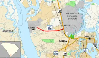 South Carolina Highway 116 (SC 116) is a 3.400-mile-long (5.472 km) state highway located entirely within Beaufort County, South Carolina, in the southern part of the U.S. state of South Carolina. Also known locally as Laurel Bay Road, SC 116 connects the Laurel Bay military housing development with the Marine Corps Air Station Beaufort (MCAS Beaufort) facility.