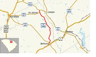 South Carolina Highway 346 (SC 346) is a 12.580-mile (20.246 km) state highway in Kershaw County, in the northern part of the U.S. state of South Carolina. It is a north–south highway traveling between Bethune at SC 341 and SC 903 about two miles (3.2 km) west of Catarrh. Except within Bethune, it travels through rural wooded areas of the Sandhills region of the state.