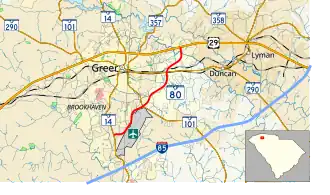 South Carolina Highway 80 (SC 80) is a 5.620-mile (9.045 km) primary state highway in the state of South Carolina. The highway serves as a bypass, connecting SC 14 to U.S. Route 29 (US 29) in Greer.