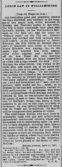 "Lynch Law in Williamsburg" – The KKK claimed responsibility when Daniel Edwards and Alex McClam were hanged near Kingstree, S.C. in April 1871[1]
