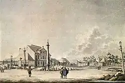 In 1770, to the south of Warsaw agglomeration were erected the fortification lines, known as the Lubomirski Ramparts, which surrounded the city.[26][38] Across the lines were set up tollhouses as the only entrances to the city, including at the Union of Lublin Square.[39] Later, in 1818, at the location were opened the new Mokotów Tollhouses designed in Neoclassical style, which stant there to the present day.[40]