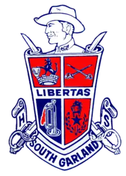 South Garland High School (SGHS) is a secondary school located in Garland, Texas. The school is part of the Garland Independent School District. The mascot for SGHS is the Titan, after retiring the Colonel, and the school colors are red and Columbia blue. The top right “square” on their shield used to be the confederate flag later being replaced by the swords. In 2009, the school was rated "academically acceptable" by the Texas Education Agency.[3]