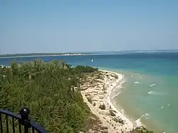 This is the third lighthouse built on the island. Construction of the first began in 1839 and the 1-1/2-story lighthouse with a lens in the cupola first went on in 1840, under the care of Lighthouse keeper William N. Burton, who had a thriving lumbering business.[2] It had a Lewis lamp, which was upgraded to a fourth order Fresnel lens /freɪˈnɛl/. Deterioration of the building led to the lighthouse being completely rebuilt in 1858. Over time this light was found to be deficient, and the current lighthouse was built in 1872. With a third order Fresnel lens sitting 91 feet (28 m) above the foundation, this light boasted a focal plane of 104 feet (32 m).[3] The site is under the control of the National Park Service, in conjunction with the Sleeping Bear Dunes National Lakeshore.[4] It is listed in the National Register of Historic Places.[5] The lighthouse was decommissioned in 1958, and is now a museum. It is not operational.[6]