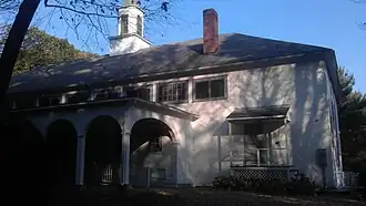 South Mountain is set on 200 acres (81 ha) of primarily woodland, formerly part of the Coolidge estate. The grounds are operated by the non-profit that manages the facility as a nature preserve open to the public on a year-round basis. The hall is a single-story timber-frame structure, built to resemble a church. It has a hip roof with a cupola, at the center, and a porte cochere at the main entrance on one of the long sides. The long side opposite the entrance has five bays, each of which is fitted with a French door, and there are casement-style windows above them for ventilation. The main timbers for the building were taken from an old textile mill, and the seats were pews taken from a church. The interior is finished with old wooden paneling. The hall is sited adjacent to an open lawn, from which the music can also be heard.[4] In addition to the hall Mrs. Coolidge had cabins built to provide housing for performers.