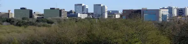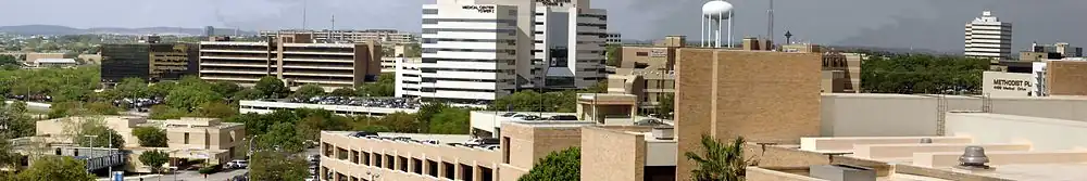 Panoramic view looking east of STMC, as seen from the UTHSCSA medical school. Seen from R to L are Methodist Children's Hospital, Methodist Heart Hospital, Methodist Gamma Knife Center, Texas Neuroscience Institute, and Methodist Plaza.