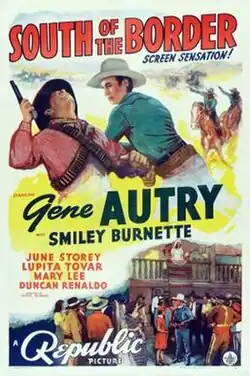 South of the Border is a 1939 Western film directed by George Sherman and starring Gene Autry, Smiley Burnette, and June Storey. Written by Betty Burbridge and Gerald Geraghty, based on a story by Dorrell and Stuart E. McGowan, the film is about a federal agent who is sent to Mexico to prevent foreign powers from gaining control of Mexican oil refineries and fomenting revolution among the Mexican people.[2]