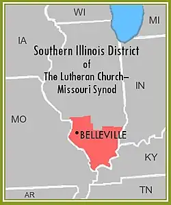 The Southern Illinois District is one of the 35 districts of the Lutheran Church – Missouri Synod (LCMS), and covers the southern third of the state of Illinois; the rest of the state is divided between the Northern Illinois District and the Central Illinois District.[1] In addition, one congregation in Granite City is in the non-geographic SELC District. The Southern Illinois District includes 96 congregations[2] and 1 mission start,[3] subdivided into 11 circuits, as well as 14 preschools, 22 elementary schools, and 3 high schools.[4] Baptized membership in district congregations is 43,046.[5] District pastors and lay members are involved in ministry in 27 prisons and jails located in the District. The District also carries out campus ministry at two colleges and supports an elementary school in East St. Louis.[6]