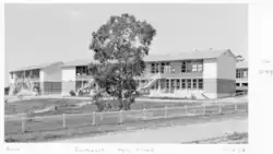 The site was cleared by November 1954 and tenders called for the transport of building materials from the railway to the school site.[33] Construction commenced soon afterwards. The initial teaching buildings comprised three Hawksley prefabricated school buildings imported from Britain. All three (Blocks A, B and C) were erected by the end of July 1955 and teaching commenced there in late August 1955.[34][35][1]