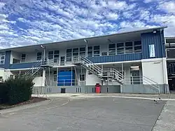 The ground floor contained a staff room (former science laboratory) and classrooms (former science lecture room) at the western end; and toilet blocks and a store room (former locker rooms) at the eastern end. A large room in the centre (former student recreation area) had been partitioned to form a special education services area, connected to an adjacent quiet room (former locker room). The interior masonry walls were rendered and the flat-sheeted ceilings had cover strips.[1]