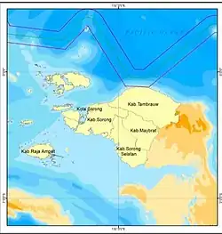 Southwest Papua (Indonesian: Papua Barat Daya; Indonesian pronunciation: [paˌpua ˌbarat̚ ˈdaja]) is the 38th province of Indonesia to be created and was split off from West Papua on 8 December 2022.[4] Despite being named "southwest", this is actually a misnomer and this province is actually located in the northwest edge of Papua. The province comprises the Greater Sorong area (Indonesian: Sorong Raya; Indonesian pronunciation: [ˌsɔrɔŋ ˈraja]) which consists of Sorong City, Sorong Regency, South Sorong Regency, Maybrat Regency, Tambrauw Regency, and Raja Ampat Regency.[5][6][7] The Bill (RUU) on the Establishment of the Southwest Papua Province was passed into law (by Act No. 29 of 2022), and therefore, it became the 38th province in Indonesia with effect from 8 December 2022.[8]