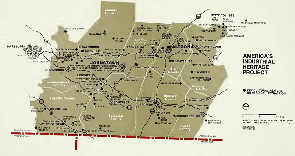 The purpose of America's Industrial Heritage Project was twofold, according to "Action Plan: America's Industrial Heritage Project", an August 1987 publication of the Heritage Preservation Commission. "First, there will be an examination of the significant contribution of the region's iron, steel, coal, and transportation industries, which helped fuel and move America's industrial growth and development and establish its standing among the nations of the world."[2] Many of the region's cultural resources related not only to its heritage but to the present and future as well. "Second, in addition to the historic sites, the project will use sites within Johnstown and Altoona as focal points for a nine-county tourism promotion program."[2] Tourism development efforts were to take advantage of the region's scenic, natural, and recreational areas and will include these resources as integral to the planning process. Much of the project's background was based in a 1985 National Park Service (NPS) study of the region entitled Reconnaissance Survey of Western Pennsylvania Roads and Sites. The NPS study identified the cultural resources at Johnstown and Altoona as focal points for new tourism initiatives.[3]