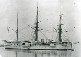 Designed for colonial service,[3] she had two funnels and was rigged as a barque.[4] Her machinery was manufactured by the John Penn Company of Greenwich, United Kingdom.[1] The original main battery of Armstrong-built 8-inch (203 mm) guns was obsolescent when she was completed, and were quickly replaced with more modern Hontoria-built 6.4-inch (163 mm) guns (a heavier main battery than that carried by her two sisters Castilla and Navarra), at least four of which were mounted in sponsons.[4]
