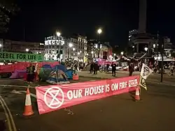 Extinction Rebellion banner citing Thunberg's speech "Our house is on fire" (London, October 2019)