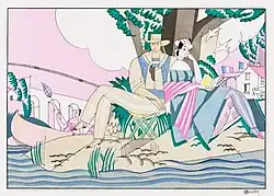 The idea for Sports et divertissements was initiated by Lucien Vogel (1886-1954), publisher of the influential Paris fashion magazine La Gazette du Bon Ton and later founder of the famous pictorial weekly Vu. It was conceived as an haute couture version of the livre d'artiste ("artist's book"), a sumptuous, expensive collector's album combining art, literature, and occasionally music, which was popular among French connoisseurs in the years before World War I.[5][6] Gazette illustrator Charles Martin provided the artwork, 20 witty copper plate etchings showing the affluent at play while dressed in the latest fashions. The title itself was an advertising slogan found in women's magazines of the period, designed to draw tourists to upscale resorts.[7]