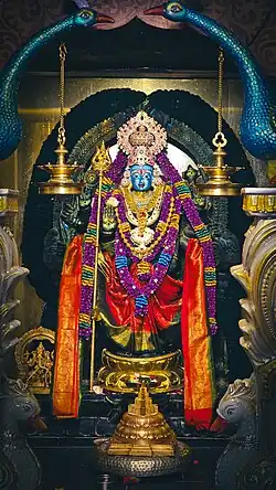 The temple is located in a pre-existing warehouse, with floor heating, new sewer lines and a new kitchen subsequently installed. The main altar is located in the middle of the biggest room. Several lions, the mounts of the Hindu Goddess Durga, enthrone on the dome above the decorated portal, as well as the deities and the other colorful altars with their small turrets, which were built on the walls of the room – they all were shipped from India.[2] The Temple is located at Ediker Strasse 24, 8635 Dürnten.[1]