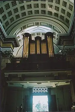 The organ, by Charles Allen, is contemporary with the chapel, and is on a high west gallery, under the barrel vault. English classical organ Despite the small specification, the organ is laid out grandly and occupies a big mahogany case with a gilded front (the facade starts at 8' C – the four lowest Open Diapason pipes are inside). The Great Organ is in the obvious place at impost level, and the tiny swell-box is above and behind, with the Pedal Pipes on either side below it. The entire base of the organ is occupied by an enormous double-rise reservoir, about twelve feet by six.