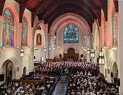 St. Andrew's-Wesley United Church is an affirming church located in the downtown core of the city of Vancouver. Part of the United Church of Canada, it welcomed its first congregation in 1933. Renowned for its architecture and art, the church underwent a major restoration beginning in 2019. It holds three services every week, including the long-standing jazz vespers.