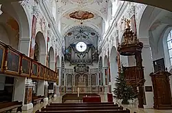 The nave seen from under the choir gallery. The Fugger Chapel, at the west end of the church, is separated from the church by a marble balustrade decorated with putti.