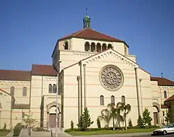 The current Lombard Romanesque church building was built in 1927. It was designed by architect Ross Montgomery.[5] The church is constructed of reinforced concrete with a high altar made of carved French Caen stone.[1] In July 1927, as the structure was being built, the Los Angeles Times reported: