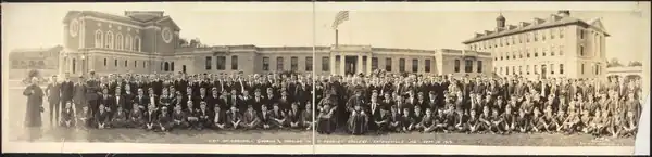 On March 16, 1911, disaster struck: the college was completely destroyed by a fire that began in the chapel cellar. None of the 200+ faculty and students were killed or injured. Sacred vessels and vestments, along with thousands of priceless manuscripts and books were lost. The burned-out shell was pulled down, and the salvageable building materials were transported to Catonsville, where the college was quickly rebuilt. All that remained were standing ruins of the 1906 Recreation Hall.[6][Note 1]