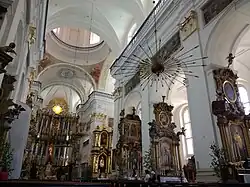 The cathedral was consecrated in 1705 to St. Francis Xavier by bishop Teodor Potocki. The ceremony was attended by the Russian Emperor Peter the Great and the King of Poland Augustus II the Strong.[2] Sixty meters in length and thirty meters wide, it became one of the largest in Europe. During the 18th century the Jesuits were decorating the cathedral with frescoes, ordered altars and baroque domes. The retable (lat. 'retabulum') got more than 70 sculptures of high artistic value, 20 on the first level, 15 on the second, and 14 on the third. Among them there are four female figures as personification of the continents, two lions, 14 angels, etc.[1]