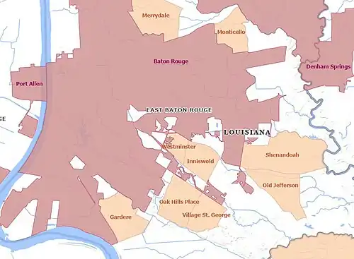 St. George is the newest incorporated city in Louisiana and was approved in a ballot initiative on October 12, 2019.[1] Upon incorporation, it became the second largest city in East Baton Rouge Parish.[2][3] The city originated from a previously unincorporated area of East Baton Rouge Parish located southeast of the City of Baton Rouge.[2][4]