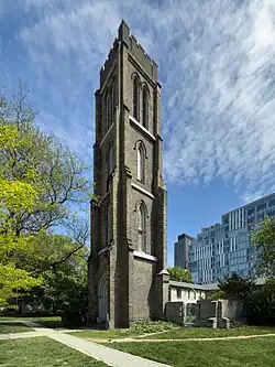 The cornerstone of the church was laid on Monday, August 19, 1844 by Bishop John Strachan[4] and the church opened as St. George the Martyr Anglican Church on November 9, 1845. The original church was located at 205 John Street, on land donated by the Boulton family (who lived in The Grange). It was the third Anglican parish in the city, after St. James Cathedral and Little Trinity. The Gothic Revival style church with 150-foot spire was designed by Henry Bowyer Lane and the bricks were built from clay from Ramsden Park.[3] The parish hall (now the church's place of worship) was constructed in 1857 by Kivas Tully and the rectory (now artist studios) was constructed in 1865 by Gundry & Langley.[5][6]
