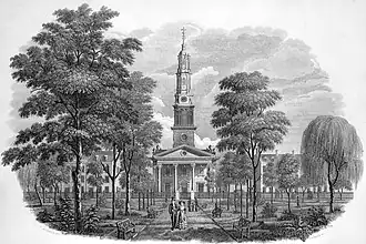 It was constructed in 1803 to designs by John McComb Jr. and his brother Isaac McComb on Varick Street, facing St. John's Park. McComb gave it a sandstone tetrastyle prostyle portico supporting a tower and multi-storeyed spire that rose to 214¼ feet. Master builders for the chapel have been recorded as T. C. Taylor, Henry Hedley, Daniel Domanick and Isaac McComb.[1] The chancel was added in 1857 to designs by Richard M. Upjohn.[2]