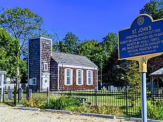 St. Johns Episcopal Church and Cemetery is a historic Episcopal church and cemetery on Montauk Highway on the northeast side, about 300' northwest of the junction with Locust Avenue, Town of Islip in Oakdale, Suffolk County, New York. The church is a small, rectangular one story building with a gable roof, wood shingle siding, and a simple painted wood exterior trim. It features a three-story, square, engaged tower with a shallow pyramidal roof. It was enlarged and remodeled in 1843 and restored in 1962; the stained glass window was added in 1873. The cemetery contains about 100 graves with burials dating from the late 18th century to the early 20th century.[2]